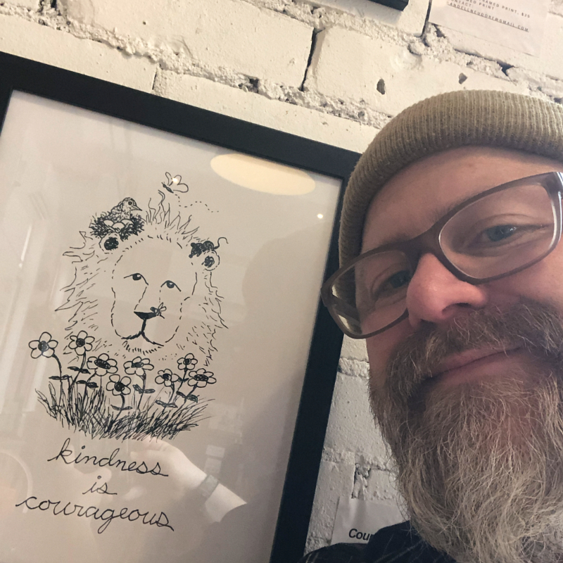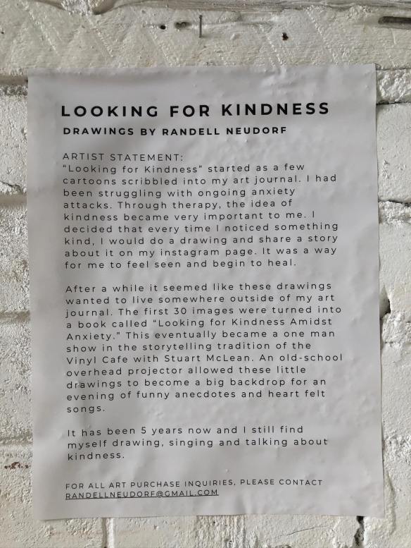 “Looking for Kindness” started as a few cartoons scribbled into my art journal. I had been struggling with ongoing anxiety attacks. Through therapy, the idea of kindness became very important to me. I decided that every time I noticed something kind, I would do a drawing and share a story about it on my instagram page. It was a way for me to feel seen and begin to heal.