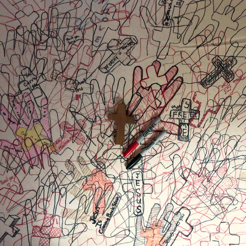 The picture above is from one of the TrueCity Prayer Stations I created this year. People were invited to trace their hand and a wooden cross as they reflected on Jesus’ words in Matthew 16:24, “If any wish to come after me, let them deny themselves and take up their cross and follow me.”